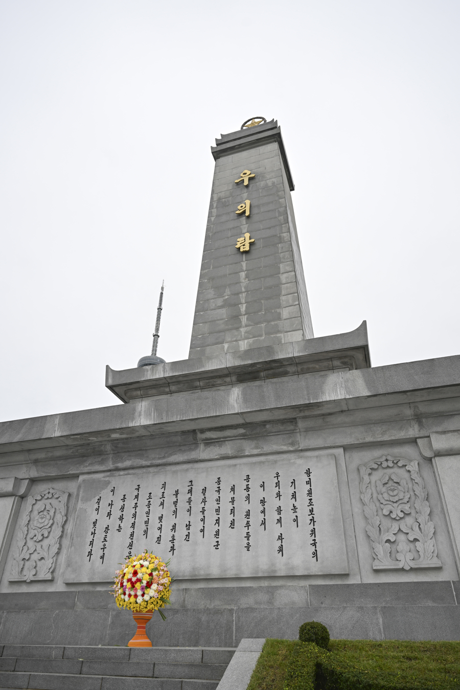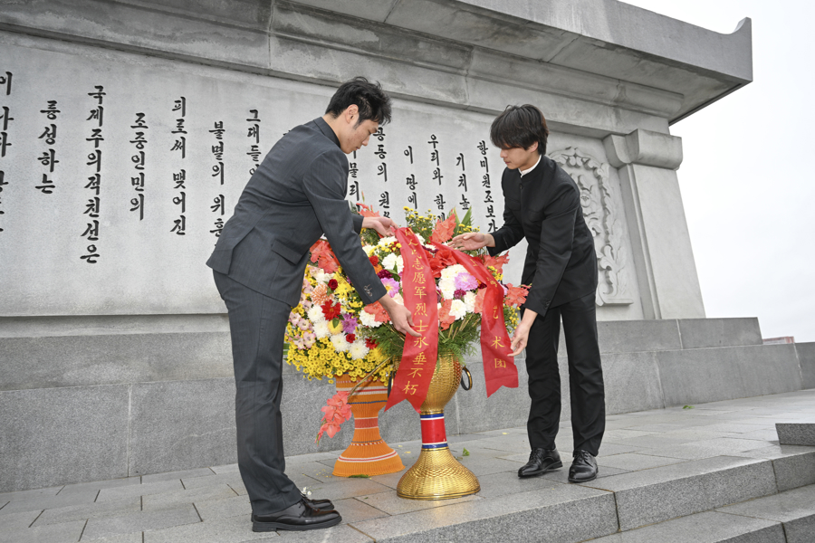 上海艺术团还在10月10日上午冒雨参谒了中朝友谊塔,并庄重献花,为志愿军烈士默哀致敬。中朝友谊塔内存有10本志愿军烈士名册,记录着22700名在抗美援朝战争中获得英模称号的志愿军烈士名单。韩真说:“志愿军跨过鸭绿江,把鲜血流在了这片国土上,在他们战斗过的国家看到他们被铭记着、被纪念着,内心很感动,希望用艺术的表达让英雄的故事继续流传。”