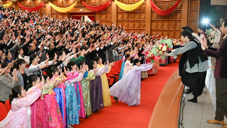 大病初愈重返舞台的朱洁静告诉自己,这场演出不容有失,必须全力以赴才不留遗憾。两次谢幕,她都眼含热泪。“中朝两国的艺术家和幕后工作人员,所有人都在全力托举舞台上的一切。谢幕时,我们向观众席,向热情友好的朝鲜观众深深鞠躬。”